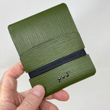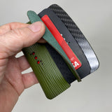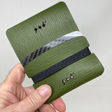 The Arch™ Traveler™ • Epi Green 2CF wallet embodies simplicity and flexibility. The exterior wrap is laser cut from premium-quality vegetable-tanned Italian leather with the distinctive Epi texture. You will love how quality leather looks better with age. One gloss black and one matte black carbon fiber dividers are included and offer different looks if you rearrange the dividers.