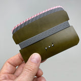 A rubber ring brings all the modular elements together in alignment. The band stays in place. Access to cards is facilitated by squeezing the long dimension of the wallet to flex the dividers and create an opening for your fingers. Access your cash from the tall side by pulling the leather down with your thumb.