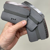This wallet has a shorter front for your cards and a back tall enough to conceal your cash. Fold your money once and not twice as many minimalist wallets require. A rubber card valet folder helps secure three groups of cards.